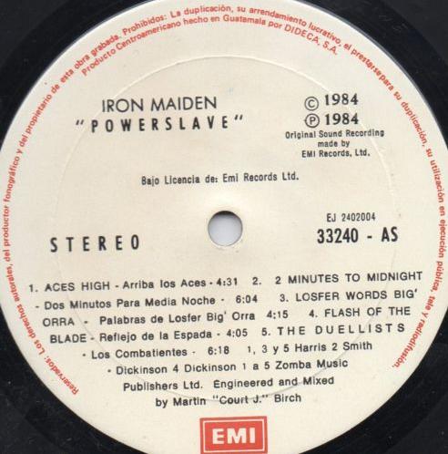 | Iron Maiden | Brazil 1990 | EMI 07269. 07269 and "FABRICADO E DISTRIBUÍDO POR FONOBRÁS" yellow labels | LP |